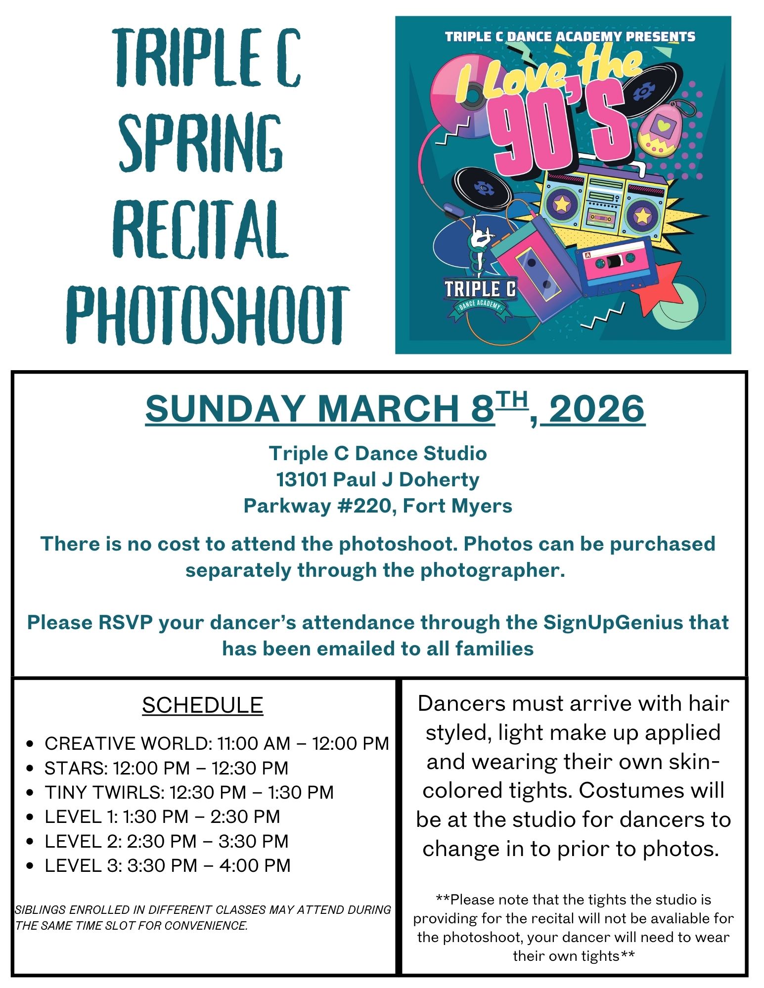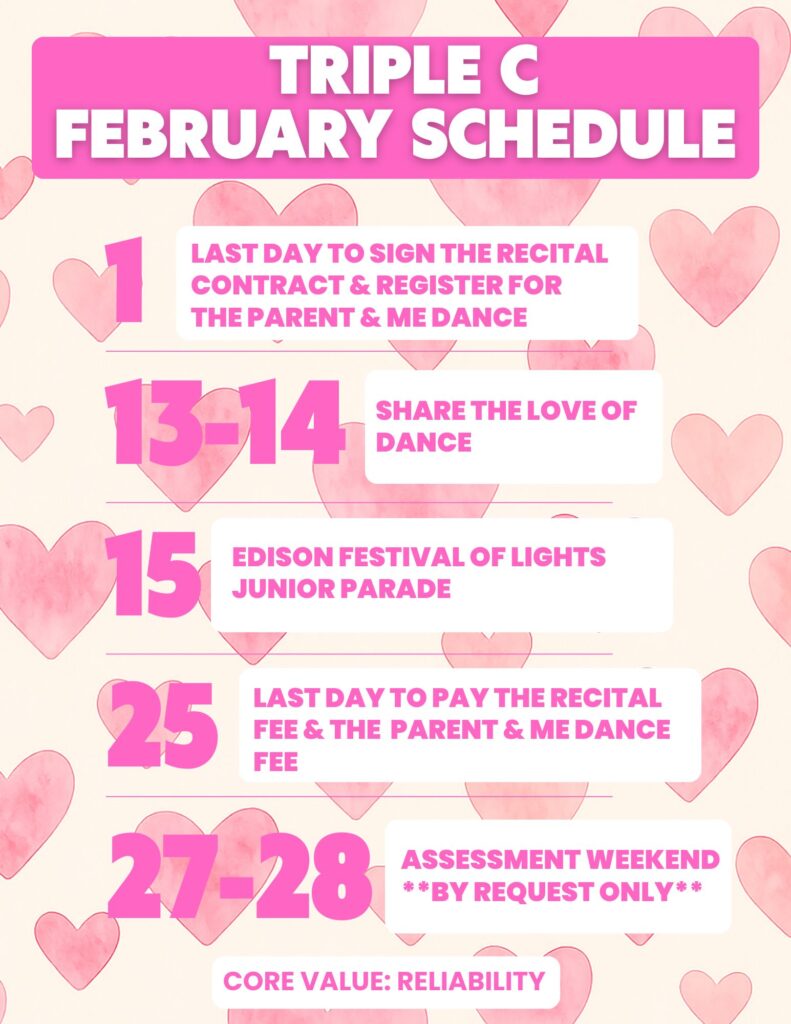 February is packed with exciting moments, important deadlines, and special events at Triple C Dance Academy! Please take a moment to review the key dates below so your dancer stays on track and you don’t miss anything important.